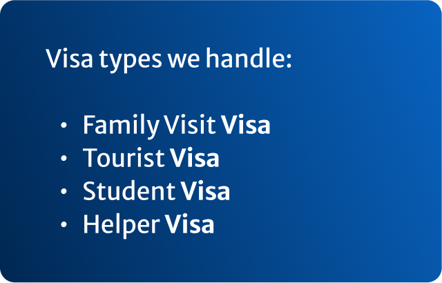 We tailor your checklist and file to your situation (family visits, students, helpers, etc.) and advise on the exact supporting documents that strengthen your application.